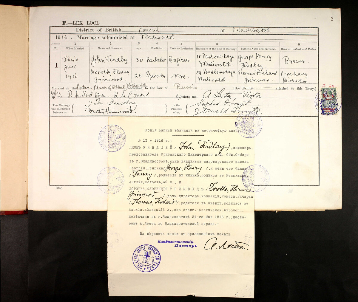 На тот период, относительно браков за рубежом в Великобритании действовал специальный закон FOREIGN MARRIAGE ACT 1892 (Акт об иностранных браках от 1892 г.). Согласно п. 10 данного Акта, в январе каждого года, брачный офицер (или брачный чиновник), а им во Владивостоке выступал консул, был обязан отправлять соответствующим должностным лицам в Великобритании копии документов о регистрации брака, заверенные печатями. Так что эти документы ежегодно отправлялись в Великобританию.