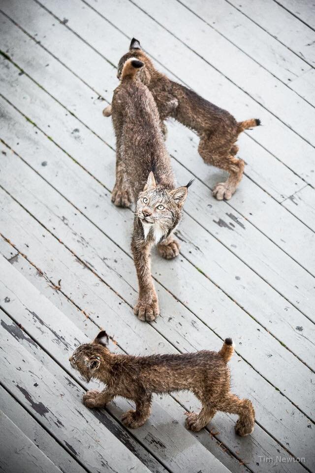 Тим Ньютон с самого рождения проживает на Аляске в своем собственном доме. Он увлекается фотографиями дикой природы, которая в этой части света остается практически нетронутой человеком. Осенним утром Тим проснулся, разбуженный странными звуками, доносившимися с веранды. Посмотрев за окно, он с удивлением увидел маму-рысь и семь играющих там рысят. Схватив фотоаппарат, Тим начал фотографировать кошачью семью (источник фото). Несколько дней назад Тим приметил, что неподалеку от его дома появилось много кроликов. Скорее всего, рысь приводила своих котят, чтобы научить их охотиться. Увидеть рысь в живой природе — чрезвычайно сложно. Это осторожное животное сразу же прячется, как только учует запах постороннего или уловит его шум, поэтому Тиму невероятно повезло После игры рысь с рысятами ушли по своим делам — наверное, в свой собственный дом.