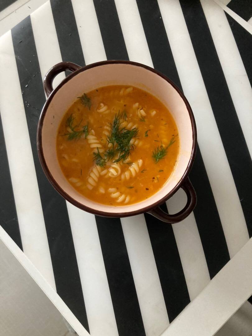 Ингредиенты: Помидор (у меня жёлтые), Вермишель, Лук, Масло растительное, масло сливочное (для жарки), Соль,, Смесь перцев, болгарского перца, Итальянские травы, Вода, чеснока Способ приготовления: На помидорах сделать надрезы, залить кипятком на 10 минут и снять кожу. Мелко порезать перец и измельчить в блендере вместе с помидорами. Вермишель отварить в подсоленной воде до полуготовности. Лук мелко порезать и обжарить на смеси масел. В самом конце добавить выдавленный чеснок. Соединить обжаренный лук с чесноком и томатную массу. Варить 3-4 минуты. Затем добавить вермишель, воду (горячую) Посолить, поперчить, добавить итальянскую смесь и проварить ещё 3-4 минуты. Посыпать зеленью. Всё, супчик готов👍