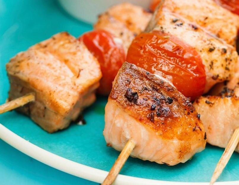 Ингредиенты: 400гр. филе сёмги или лосося. 1 кабачек. 8 помидоров чери. 1 фиолетовая луковица. Для маринада(рыба) : 1 ст.л. оливкового масла. 2 ст.л. соевого соуса. 0,5 лимона. 0,5 ч.л. приправы для рыбы. молотый чёрный перец. Для маринада(кабачки): 1 ст.л. соевого соуса 1 ст.л. оливкового масла. Как приготовить: 1. Деревянные шпажки для шашлыка замочить на 15-20 минут в воде. 2. Смешать оливковое масло, соевый соус, приправу для рыбы,чёрный перец и сок половины лимона. 3. Рыбу порезать на квадратные кусочки. Уложить в пакет, залить маринад, перемешать. Оставить мариноваться на 20 минут. 4. Кабачок порезать кружками толщиной 8-10 мм. Лук очистить, порезать кольцами. Лук и кабачки положить в другой пакет. Смешать соевый соус и оливковое масло. Залить смесь в пакет с кабачками и луком. Оставить мариноваться на 15 минут. 5. Нанизить, чередуя, на шпажки маринованные рыбу, кабачки, лук и помидоры. Готовить на гриле 10-12 минут. Приятного аппетита!!!!