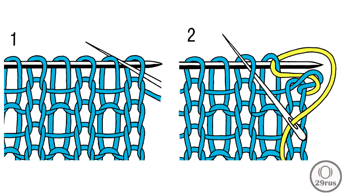 При закрытии петель вязаного изделия с помощью иглы сохраняются та же эластичность и тот же внешний вид, как при итальянском наборе петель. Последние 4 р. перед закрытием вязать на спицах, которые на полразмера тоньше основных рабочих спиц. При этом лицевые петли вязать лицевыми, изнаночные снимать, как при изнаночном вязании, и нить протягивать перед петлями. При вязании круговыми рядами 1-й из последних 4 рядов вязать, как при выполнении рядов в прямом и обратном направлении, но в следующем круговом ряду лицевые петли снимать, как при лицевом вязании, нить протягивать за петлями, а изнаночные петли вязать изнаночными. Оба этих круговых ряда повторить еще 1 раз. Затем петли закрыть с помощью вышивальной иглы с тупым концом. В качестве нити для закрытия петель использовать пряжу, из которой выполнена модель, при этом нить должна быть в три раза длиннее, чем закрываемый край. Рисунок 1: иглу ввести сзади в кромочную петлю, а при вязании круговыми - в лицевую петлю, затем петлю сбросить