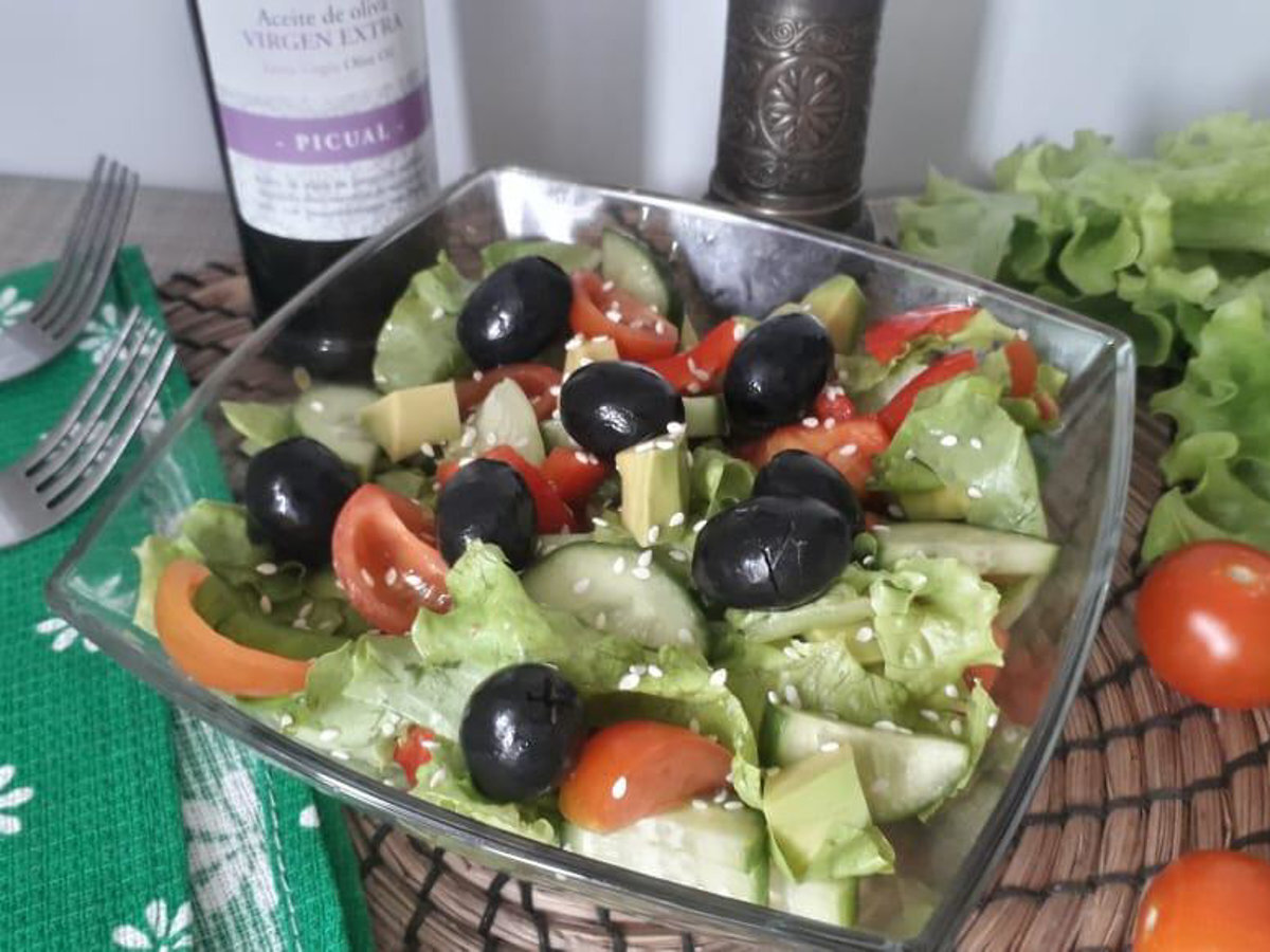 Салат из овощей с авокадо - это кладезь витаминов. Свежий , легкий, нежный салат прекрасно подойдет для обеда , для перекуса или для легкого ужина.Это идеальный вариант для ПП. Т.к салат получается достаточно ярким, он достойно может занять место на праздничном столе. Ккал: 103.18, время приготовления: 40 мин., порций: 3 #Салаты и закуски #Блюдо ПП #Закуска #На обед #На скорую руку #На ужин #Постное блюдо #Праздничное блюдо #Просто приготовить Ингредиенты Приготовление: 1. Подготавливаем продукты по рецепту. 2. Авокадо моем, освобождаем от косточки, очищаем, нарезаем небольшими кубиками и сбрызгиваем лимонным соком , чтоб не потемнел. 3. Помидорки чери нарезаем на четвертинки ( если обычный помидор, то ломтиками) 4. Огурец нарезаем ломтиками. 5. Болгарский перец нарезаем небольшими кубиками. 6. Салатные листья моем, обсушиваем бумажным полотенцем, рвем руками и укладываем в салатник. 7. Добавляем в салатник все овощи, хорошо перемешиваем и сбрызгиваем оливковым маслом. украшае