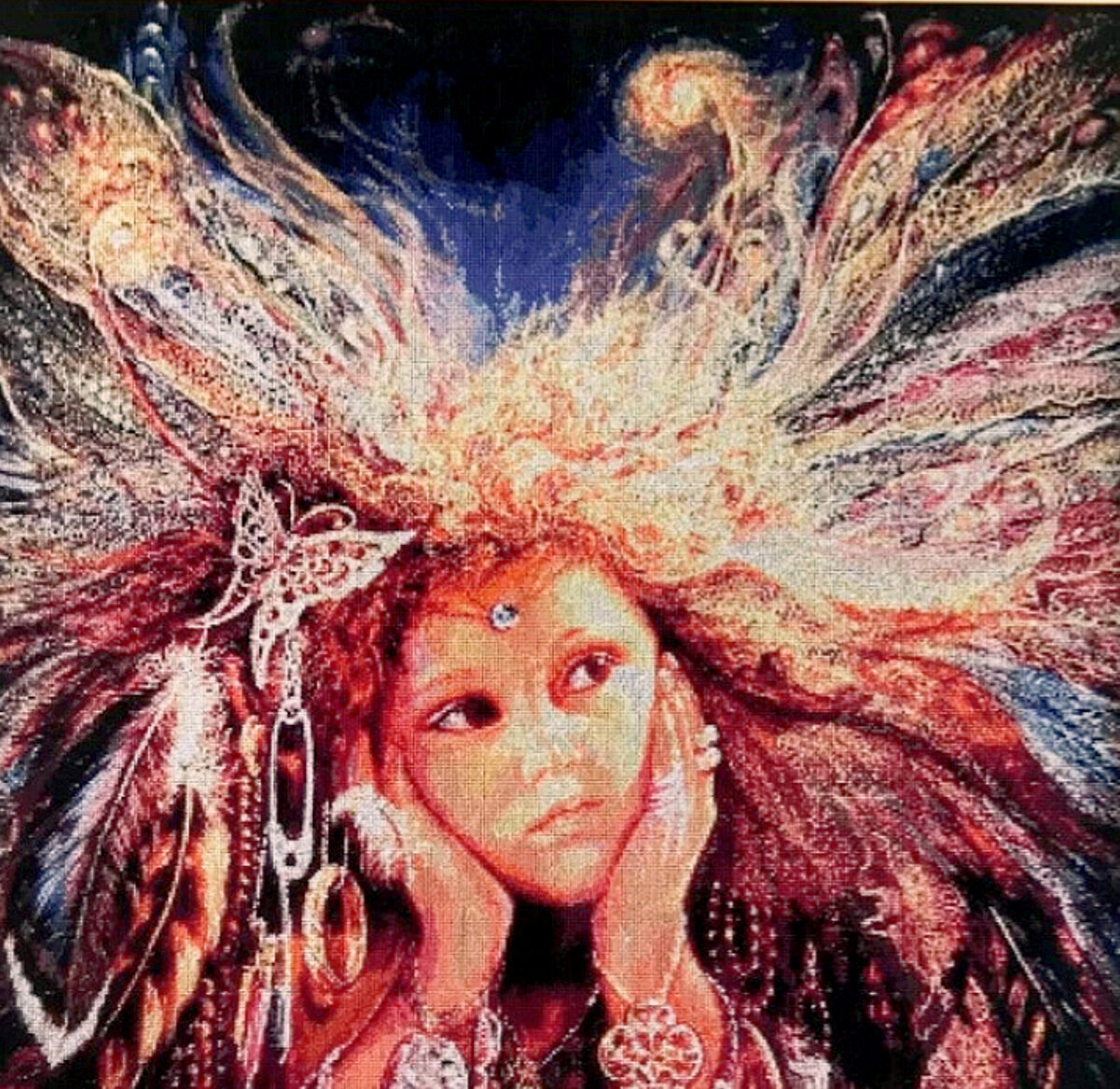 Да, кто то за такие деньги покупает квартиры, машины, дачи! А кто то может позволить себе купить картину, чтобы разбавить интерьер. Но! Я хочу поговорить с вами не только о стоимости представленных картин, а о деталях вышивки, которые уверена будут интересны вам не меньше! Итак, начну с того, что представленные в статье картины результат кропотливой ежедневной работы одной рукодельницы Оксаны из Украины. Как я поняла по вышитым сюжетам, Оксана предпочитает вышивать фантазийные дизайны. Чаще всего на картинах рукодельницы можно встретить образ женщин. Схемы для вышивки были разработаны по мотивам картин, написанных в стиле современного сюрреализма, знаменитой британской художницей Жозефиной Уолл. Стыдно признаться, о творчестве художницы я узнала именно когда познакомилась с вышивками рукодельницы. Картина под названием "Цветок из мыльных пузырей" (надеюсь перевела правильно🙄) оценена рукодельницей в 27 070.00$. Лично для меня это целое состояние. Но! Размер готовой вышивки без рамки