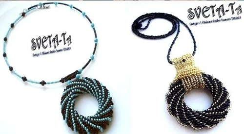 Добрейшего всем дня! Представляю вашему вниманию очередную "пересохранюшку" с исчезнувших бисерных сайтов. Автор - бусинка с ником Sveta-ta (Z4O). Дальше - текст и фотографии автора МК Здравствуйте, дорогие бусинки! Выкладываю свой первый мастер-класс, так что ловлю тапки и посылаю вам в ответ воздушные поцелуйчики) Для работы нам понадобятся: 1) Основа для оплетения. У меня готовый пластиковый бублик, но основу можно сделать самостоятельно из полимерной глины или вырезать из твердого картона (внутренний диаметр - 2.7 см, внешний - 4,7 см, ширина - 2 мм); 2) бисер двух цветов одного размера (у меня японский №11, но первые 2 кулона я оплетала чехом - это сложно, но возможно))) один цвет должен быть в тон основе, второй - контрастный, чтобы узор был четкий; 3) леска (рыболовная) 0,18мм - прим. 4 метра (3 обхвата рук); 4) игла. Итак, начинаем работу.