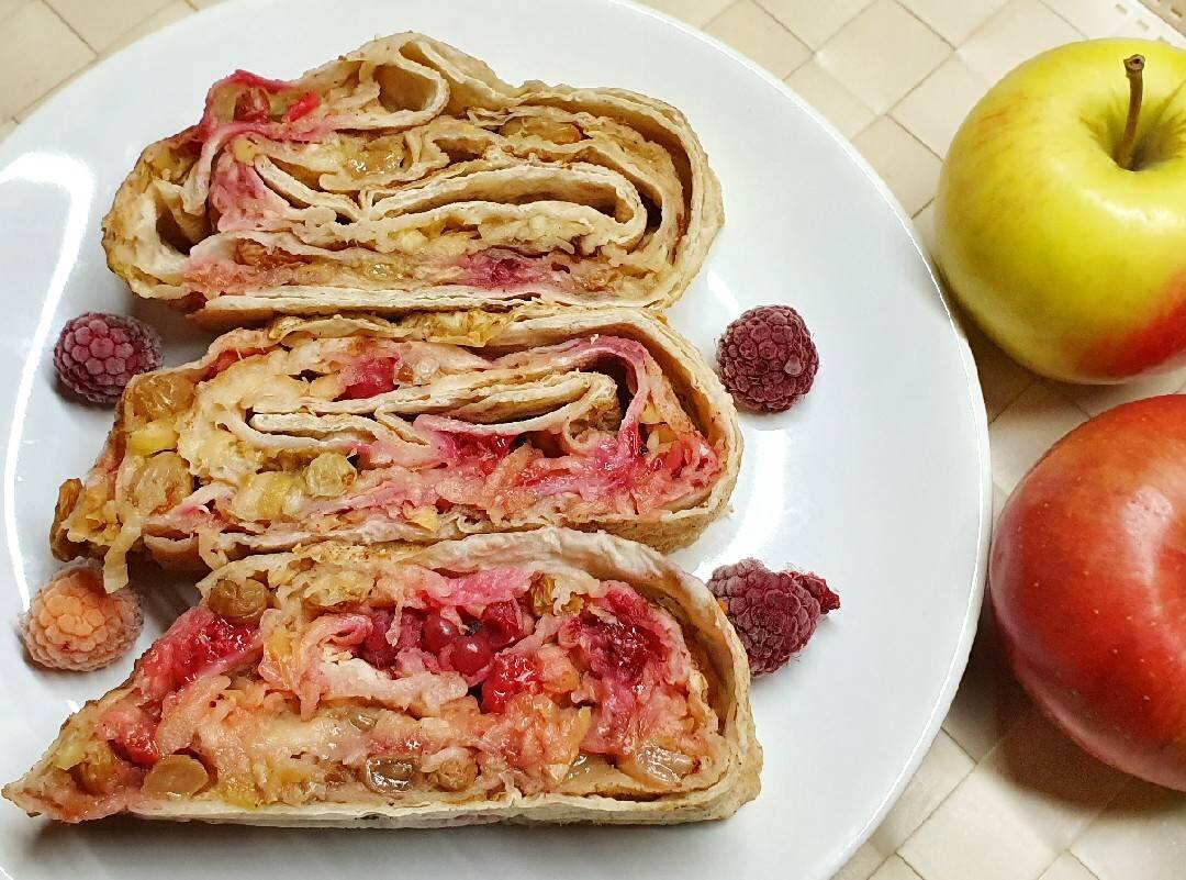 Быстрый, простой, постный рецепт из лаваша, яблок и малины. Сейчас много рецептов из лаваша, но может кому-то пригодится и этот простой рецепт. Лучше брать лаваш из тандыра. Он больше похож на тесто, чем плоский, почти как бумага, лаваш. #пост #веган #выпечка #рулет #яблоки Ингредиенты: лаваша, средних яблока, ч л лимонного сока, изюма, малины, ч л крахмала, По вкусу сахар, ст л растительного молока или сока Способ приготовления: 🔰Яблоки натереть на крупной терке и сбрызнуть лимонным соком. 🔰По желанию добавить немного сахара. 🔰В зависимости от количества выделившегося сока, добавить больше или меньше крахмала. Перемешать. 🔰Добавить изюм. Перемешать. 🔰Выложить яблочную массу на лаваш, немного не доходя до краёв. 🔰Сверху равномерно выложить малину. 🔰Завернуть длинные края на начинку и свернуть рулет. 🔰Выложить рулет в форму. 🔰Смазать верх рулета растительным молоком, компотом, соком или сладким чаем. 🔰Форму хорошо закрыть фольгой, чтобы при выпечке тесто не пересохло. 🔰Выпека