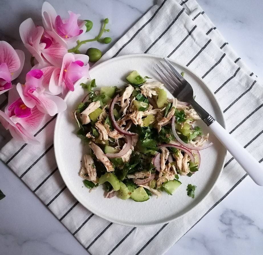 Ингредиенты: куриная грудка, луковица, сельдерея, петрушки , огурец, Для заправки:, тёртого корня имбиря, чеснока, сахара, масла, соевого соуса Способ приготовления: Куриную грудку предварительно отварить до готовности и остудить. Мясо разделить руками на волокна. Нарезать лук, огурец и сельдерей. Измельчить зелень. Смешать все ингредиенты. Для заправки смешать имбирь и измельчённый чеснок, масло, соевый соус. Заправить салат и перемешать.