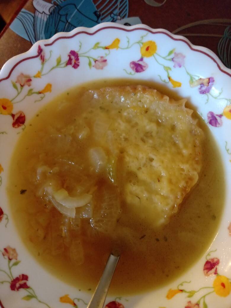 Французский традиционный суп. Ингредиенты: бульона, городской булки, Сыр, Лук Способ приготовления: На медленном огне томить лук 15 минут, не давая ему подгорать. Коричневого цвета не должно быть. Добавляем кусочек сливочного масла. Ставим кастрюльку воды на огонь, доводим до кипения. Размельчаем кубик и кладём в воду. В слегка пожаренный лук добавляем перец, соль и немного сливочного масла. Доводим лук до прозрачности. Добавляем бульон, по 2 половника, ждём 2 минуты, потом ещё немного и ещё. Когда добавили весь бульон, оставляем вариться на 15 минут. Режем булку на ломти, равные количеству едящих, слегка поджариваем с обеих сторон. На готовый бульон выкладываем булочки, сверху посыпаем тёртым сыром. Ставим с открытой крышкой на пару минут в духовку. Порционно подавать так, сразу же как достаете из духовки!