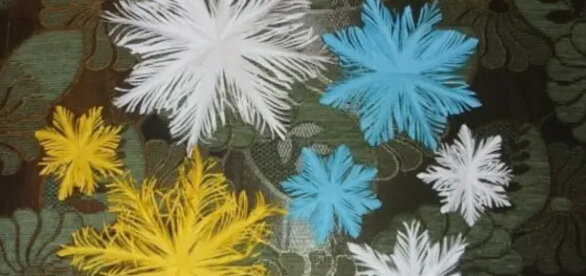 Вырезаем квадрат из листа бумаги. Сгибаем его по диагонали. Затем сгибаем получившийся треугольник пополам. Сгибаем ещё раз пополам. Такую заготовку делали для вырезания снежинки наши мамы и бабушки. И ещё раз. Берём ножницы и от сгиба сверху отрезаем ненужный угол. К центральному сгибу под наклоном делаем надрезы, не дорезая до него. Аккуратно разворачиваем снежинку. И так нарезаем несколько заготовок разного размера и разного цвета. Заготовки для снежинок лучше делать из светлых тонов бумаги. Собрать снежинки можно из нескольких заготовок разного размера и разного цвета. При необходимости склеить клеем-карандашом.