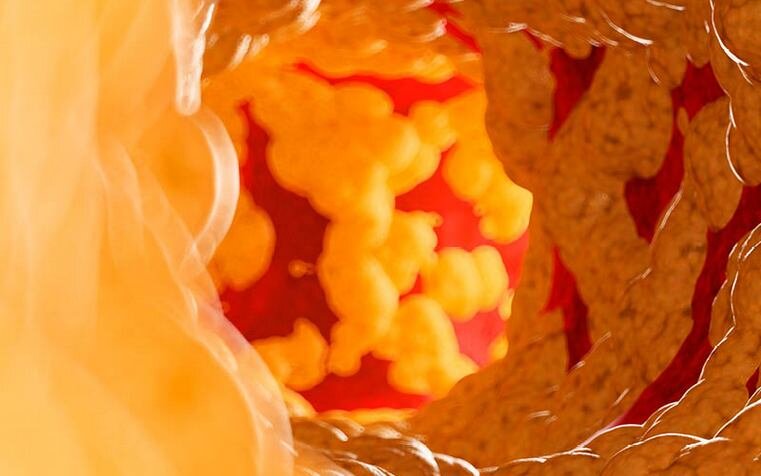 Избыток холестерина накапливается в стенках кровеносных сосудов. Вокруг этих отложений разрастается соединительная или, по-другому, рубцовая ткань, формируются отложения кальция.