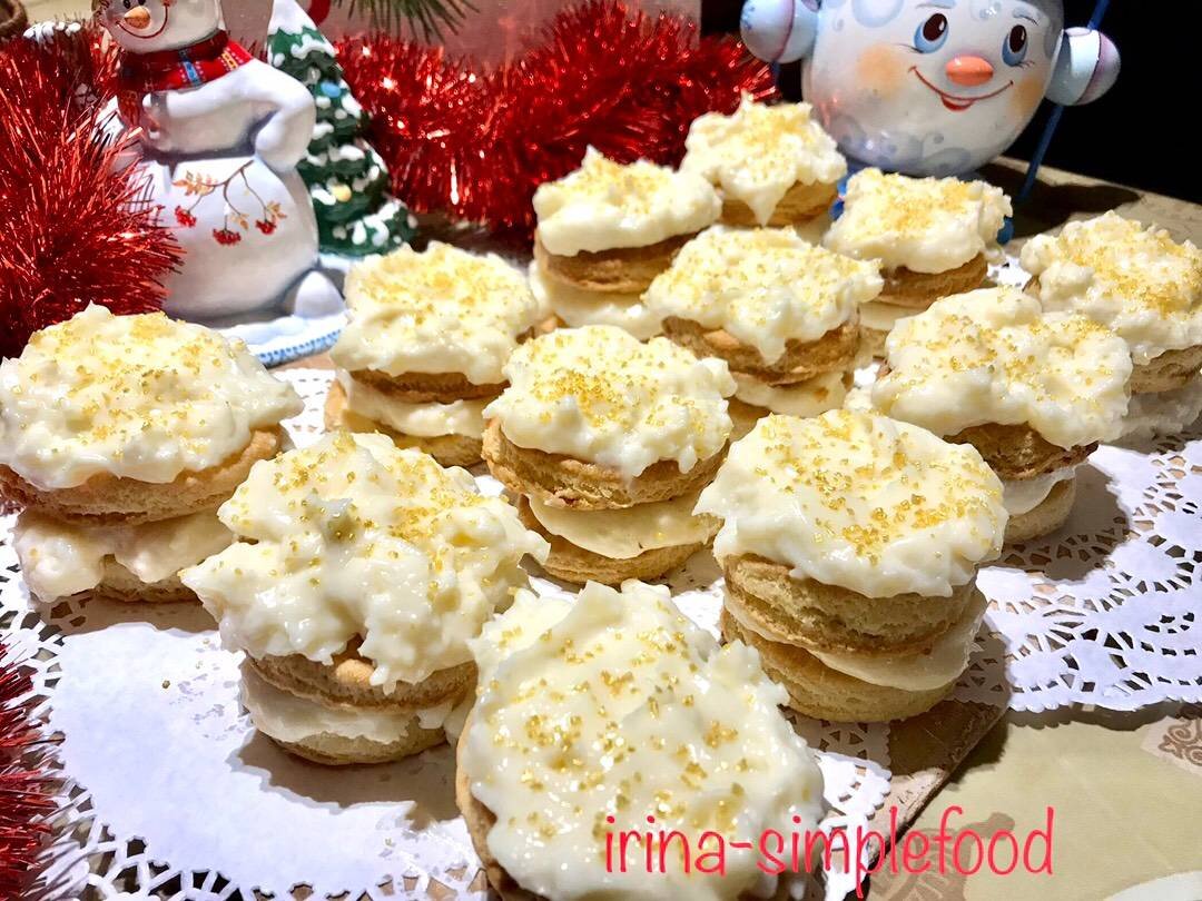 #рождество #выпечка Простое и вкусное домашнее пирожное к Рождеству и Новому году. Ингредиенты: Для теста N1:, сливочного масла, муки, Для теста N2:, муки, желток, 9% уксуса, соли, холодной воды, Для крема:, молока, яйца, кукурузного крахмала, сахара, ванилина, любая посыпка (не обязательно) Способ приготовления: Приготовить тесто размягченное сливочное масло смешать с мукой и замесить масляное тесто, раскатать его в прямоугольный пласт и отставить в сторону. Приготовить тесто взбить желток с водой и уксусом, вылить смесь в муку, замесить тесто, завернуть его в плёнку и убрать в холодильник на 15 минут. Затем это тесто раскатать в пласт чуть большего размера чем предыдущее, положить на него масляное тесто и свернуть в несколько раз, можно разделить на две части, снова раскатать, повторить 3 раза. Вырезать формой или стаканом кружочки, уложить на противень накрытый пергаментом, сбрызнуть водой, проколоть вилкой и выпекать в духовке разогретой до 210’С до золотистого цвета. Приготовить к