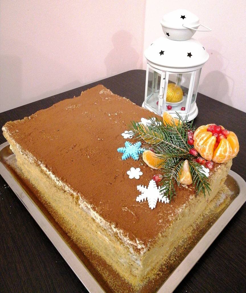 #презентація #святковеменю #випічка Торт приготовлений за власним задумом Ингредиенты: яєць, цукру, меду, масла, горіхів, борошна, розпушувача для тіста, соди, вершків 36%жирності, цукрової пудри, сиру Маскарпоне Способ приготовления: 7 яєць взбити з 250 гр цукру до пишної маси поступово додаючи 250 гр натурального розтопленого меду 50 гр масла та 100 гр обсмажених та дрібно посічених горіхів Все добре перемішуємо До 300 гр борошна додаємо 1 ч лож соди та 1 ч лож розпушувача для тіста просіюєм і поступово по ложці додаємо до тіста Ще раз все добре перемішуємо та викладаємо у форми розміром 20*28 покриті пергаментом Виходить 3 коржі Випікаємо при температурі 180 градусах до 40 хв орієнтуйтесь по своїй духовці КРЕМ ЧІЗ 500 гр вершків 36%жирності та 150 гр цукрової пудри взбити міксером до загустіння Поступово додаємо 500 гр сиру Маскарпоне і добре все перемішуємо до однорідної маси Перемащуємо кремом коржі які вже встигли охолонути Та прикрашаємо за бажанням Готуйте і Смакуйте!