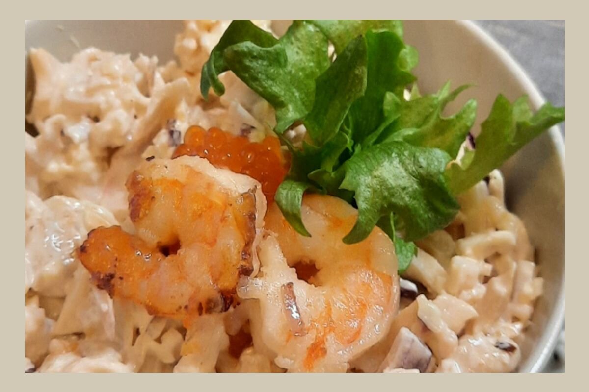И решила сделать свой привычный кальмарово-креветочный салат, как всегда, только с икрой.