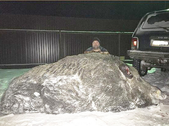В нашей стране живут десятки и сотни видов рыб, птиц, насекомых и млекопитающих. Есть среди них настоящие гиганты, их размеры поражают воображение. КАБАН. На первый взгляд странно видеть в этом списке кабана, это зверюга немаленькая, но до звания гиганта дикая хрюша никак не дотягивает. Однако не все так однозначно масса взрослого пятачка не больше 150-200 килограмм, а его высота в холке обычно не превышает одного метра, однако в России встречаются настоящие монстры. На Урале и Дальнем востоке охотники не раз добывали диких свиней массой более 500 килограмм, в 2015 году огромного кабана завалил уральский охотник его трофей потянул на 535 килограмм, высота в холке исполинского пятачка составила 1.7 метра, а это между прочим средний рост россиянина. Смотря на подобные фотографии волей-неволей вспоминается 5 подвиг Геракла, когда он победил римского вепря. Этот подвиг всегда казался малозначительным, подумаешь какому-то там дикому хряке вломил. Но если бы это был 500 килограммовый монстр