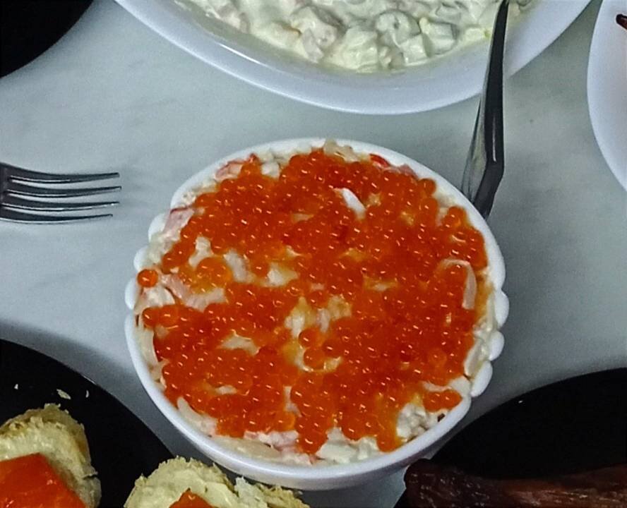 Очень, очень вкусный салат, все ингредиенты между собой особо сочетаются, рекомендую попробовать каждому! Ингредиенты: кольца кальмара, белок от яиц, крабового мяса (крабовые палочки), креветки, майонез густой , икра красная для украшения (можно и без нее) Способ приготовления: Кольца кальмара опустить в подсоленную кипящую воду, отварить 3 мин. Креветки если обычные мелкие, 1.5 мин отварить в кипящей подсоленной воде, если королевские, то отвариваем 3 мин так же в кипящей подсоленной воде. Яйца отварить. Все остудить. Кальмар, белок от яиц и крабовое мясо нарезать тонкими полосками, креветка если обычная мелкая - порезать пополам либо оставить целой, если королевская - порезать на три части. Все ингредиенты смешать. Добавить майонез, слишком много не нужно, как в обычный салат, чтобы пропиталось и немного схватилось между собой, перемешать. Если будете делать с икрой, тогда утрамбовать намного салат в салатник и оставить салат на полчаса, час для пропитки накрыв от заветривания (можно