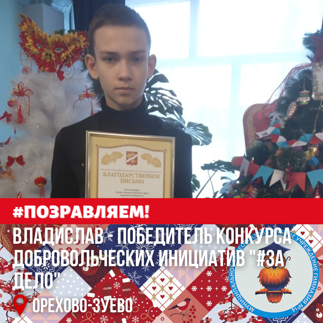 От всей души поздравляем Владислава В. с победой в конкурсе молодежных добровольческих инициатив "За дело" в номинации "Инсклюзивное волонтерство". Молодец! #гимназия14оз #гимназия #школа #ореховозуево #оз #московскаяобласть #мо #доброта #добро #волонтер