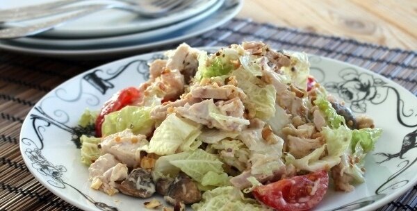 - Помидоры нарежьте дольками, капусту нашинкуйте, нарежьте на кусочки куриную грудку, сыр натрите. Все ингредиенты тщательно между собой перемешайте
