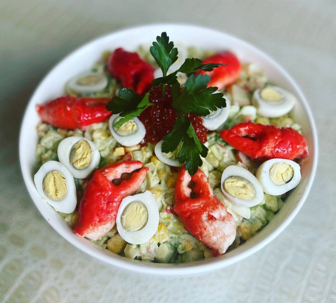 Крабовый салат с авокадо 🥑 🦀 ⠀ Ингредиенты: перепелиных яиц, крабового мяса, кукурузы, авокадо, зелёного лука, майонеза Способ приготовления: Крабовое мясо или палочки и отварные яйца нарезать крупными кубиками. Высыпать банку кукурузы. Авокадо порезать мелкими кубиками. Добавить лук. ⠀ Заправить майонезом и перемешать.