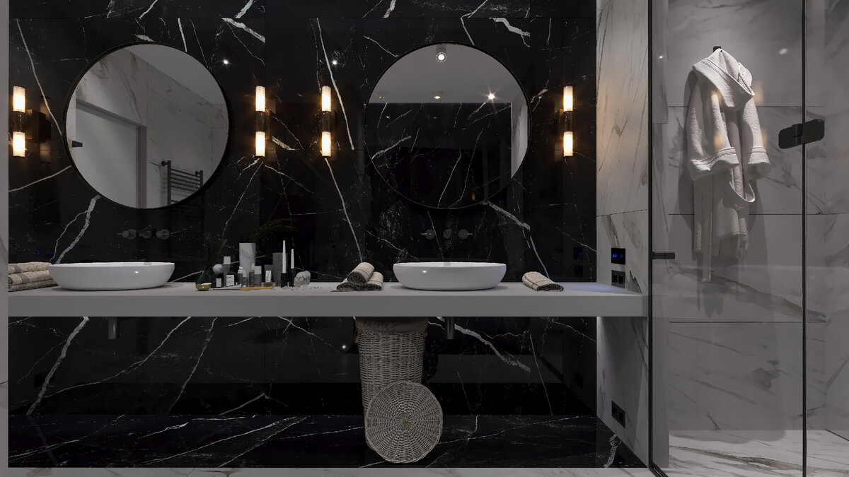 Дизайн-проект ванной 5х2,5 м в чёрно-белом керамограните на 100к.