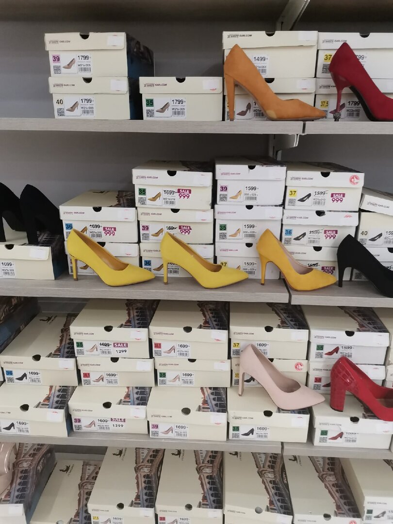 Так здорово все совпало: перед праздниками я не покупала себе туфли, хотя очень хотела, но все встречи у меня были запланированы уже после Нового года, поэтому я решила немного повременить. И совершенно не зря, потому что, вернувшись в "Кари", я увидела большую распродажу туфель. Никто не заостряет на этом внимание, магазин не украшен баннерами со скидками именно на туфли, но, если подойти к этим рядам, можно заметить, что буквально каждая коробка получила стикер "sale". А уж когда я заметила, что есть цены и в 399 рублей, я точно решила, что поделюсь находками и с вами. Причем туфли настолько все разные, что говорить о них можно долго. Начнем с тех, которые сложно пропустить из-за их цвета. У меня еще не было цветной обуви из этой категории, я покупала более спокойные и классические цвета, но мне нравится как выглядят розовые туфли с нижнего ряда. Правда они почему-то на 300 рублей дороже, чем желтые, хотя сами по себе выглядят так же. В розовом цвете цена 1299 рублей, а в желтом 999.