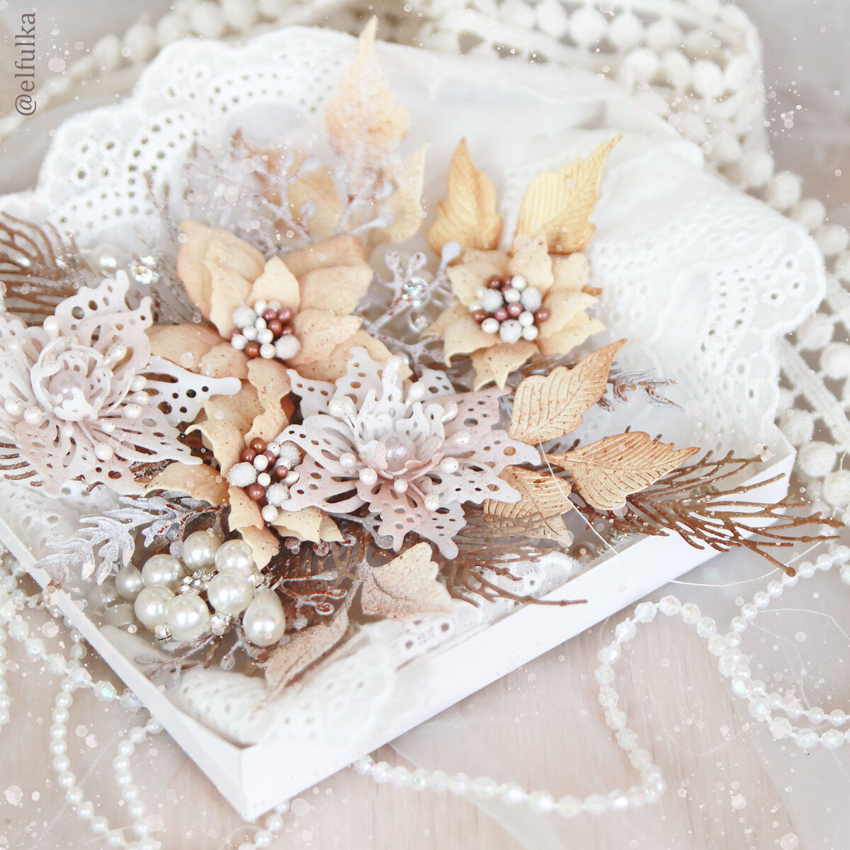 Привет-привет! Сегодня предлагаю вам понаблюдать за процессом создания сказочно красивой новогодней открытки. Размер открытки 19 х 13 см. ВОЛШЕБНЫЕ МАТЕРИАЛЫ, которые помогали мне создавать эту зимнюю открытку: 1. Для основы: плотный крафт (плотность 300гр/м2); 2. Подложка из акварельной бумаги с тиснением «скорлупа» (предварительно прошила на машинке); 3. Подложка декоративная из плотного крафт картона. С одной стороны сделала фигурный край с помощью машинки для вырубки. Нанесла брызги акриловой краской. Добавила кружево; 4. Цветы ручной работы. Все цветы я делаю сама (они не покупные). Здесь цветы и из фоамирана. Заготовки для пуансеттии вырезала вручную по шаблону, а заготовки для ажурных цветов делала с помощью ножа от Fantasy «Райский цветок»; 5. Листики и веточки (бумажная вырубка и дырокольные веточки) Вырубные элементов декорировала штемпельной подушечкой, покрывала эмалью и пудрой для эмбоссинга. Использовала разные ножи: ножи Fantasy ( «Сосновые ветки 2»), ножи