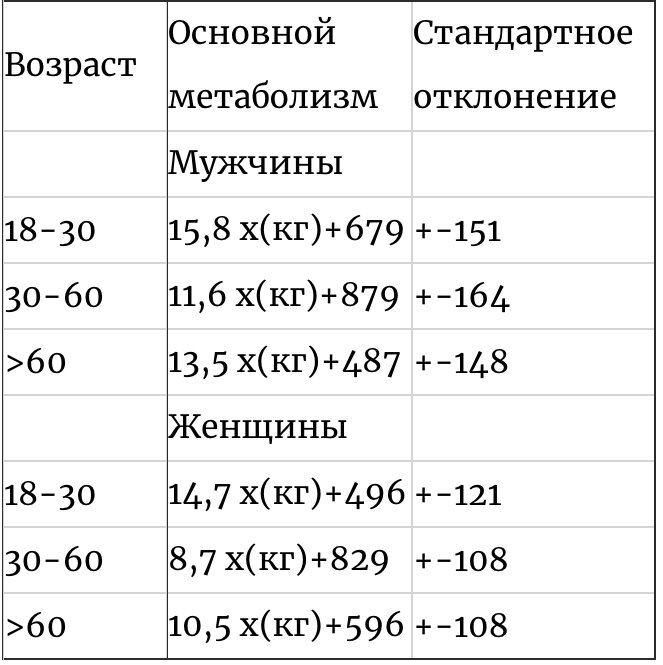 Для расчета суточных потребностей в калориях я использую коэффициенты и цифры из приведенной ниже таблицы, которые были определены экспериментально.