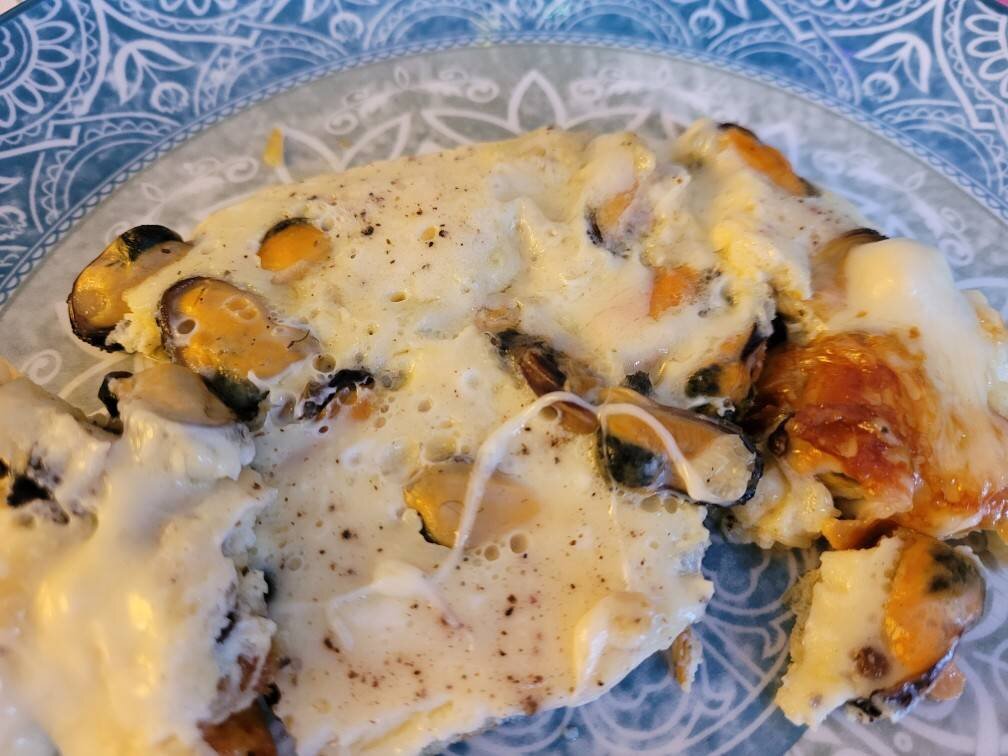 Ингредиенты: мидий, чеснока, растительного масла, сулугуни, яйца, соль, перец