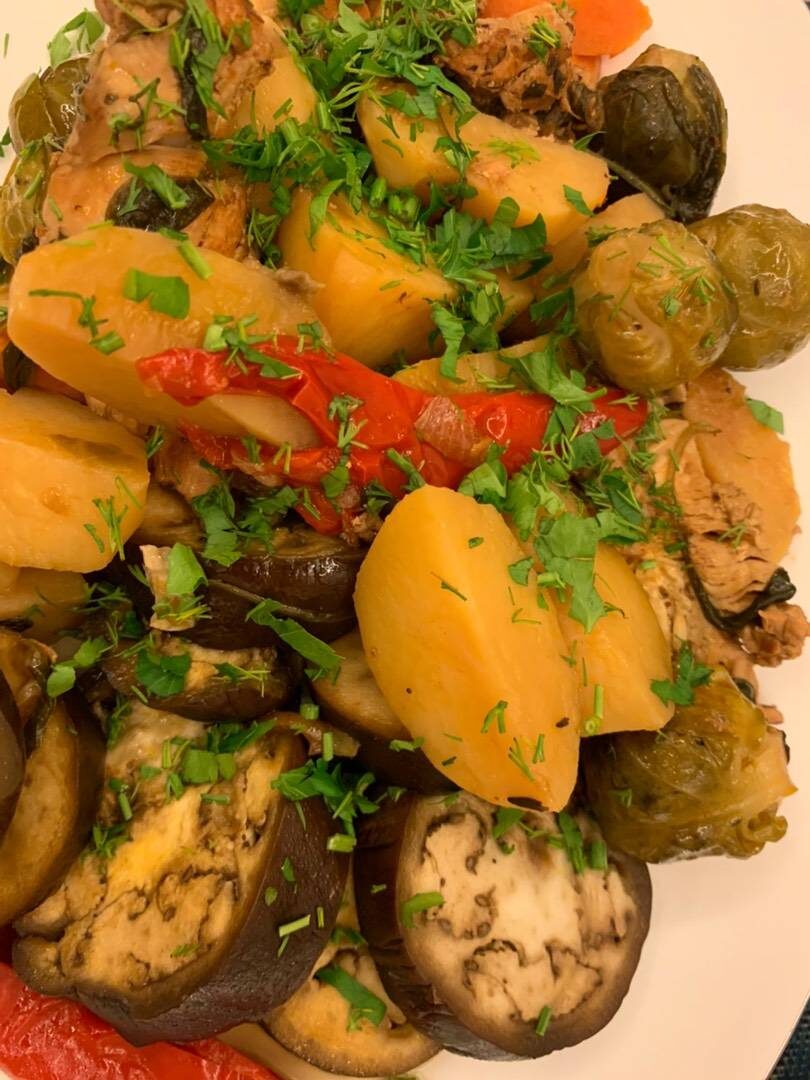 Ингредиенты: картошки, морковка, лук репчатый, бельгийской капусты, курицы, баклажан, красный болгарский перец, томатной пасты, соль, перец, специи , оливкового масла для жарки