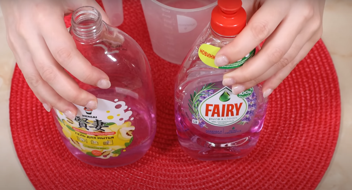 Друзья, я очень рада вас приветствовать, вы на канале Марина Жукова. В первую очередь хочу поздравить вас с наступившим Новым годом, пожелать крепкого здоровья, счастья, пусть исполняются все ваши мечты, и, самое главное, пусть год будет хорошим и легким. В новый год с новой рубрикой, которую я назвала "Экономка. В ней я буду размещать дешевые рецепты, как отмыть, очистить, отстирать, здесь будут полезные советы, как сэкономить семейный бюджет. Сегодня расскажу, как экономить на моющем средстве. Расскажу, как из одной бутылки "Фейри" сделать две, причем усилив моющие средства и сделав его более экологичным. Для этого необходимо: · взять еще один пустой бутылек, я взяла с дозатором, мне кажется, когда бутылка с дозатором, средство расходуется экономичнее; · половину бутылки "Фейри" перелить в пустой бутылек. То есть, 500 мл моющего средства разделить пополам, чтобы получилось две полупустых бутылки с "Фейри"; · взять емкость с носиком и в нее добавить 6 столовых ложек с горкой пищевой с