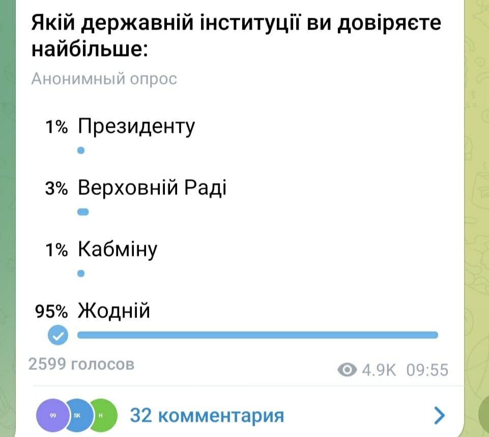 Чего только не придумывал украинский президент, чтобы поднять свой рейтинг, что только не делали депутаты его партии «Слуга народа», чтобы хоть как-то вызвать любовь электората, на какие только ухищрения не идет украинский кабинет министров, чтобы не остаться виноватым во всех экономических и социальных бедах Украины…. Но больше всего мне искренне жаль агентства, которые, по определению, сидят в позе глубокого шпагата, натягивая несуществующие цифры для утешения своих заказчиков. Вашему вниманию результаты опроса, проведенного одним из украинских ресурсов в Телеграм. Перевожу вопрос: «Какой государственной институции вы доверяете больше всего?» Ответ на скрине в комментариях не нуждается. Но потом случилось еще кое-что: Скрин я сделала 1 января. Не для того, чтобы его комментировать в своем телеграмм канале – истинные рейтинги Зеленского мы хорошо знаем от друзей с той территории. Скрин мне нужен был для аргументов со спорщиками – пригодился бы в качестве доказательств истинного отноше