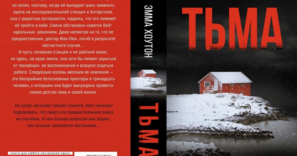 Книга, ради которой я разбудила мужа в три ночи, возобновила аккаунт в LitRes и заплатила 179 р. Детективный роман "Тьма". Автор Эмма Хоутон. Герметичный детектив. 13 человек на научно-исследовательской базе в Антарктиде. Главная героиня, Кейт Норт, прилетает в Антарктиду чтобы заменить погибшего при загадочных обстоятельствах врача. А анамнезе у Кейт сложное прошлое: автокатастрофа, зависимость от таблеток и проблемы с окружающими. В общем, это никогда не мешало стать тем самым главным героем, который все расследует и всех спасет. Для меня две главные составляющие хорошего детектива: сама детективная интрига и антураж преступления. Аннотация сулила многое. Место действия - Антарктида! Хотелось бы побольше узнать и о том, чем занимаются люди на станции, какими исследованиями, как вообще складывается жизнь в Антарктиде-то. Из текста мы узнаем две детали, которые повторяются много раз. Это тот факт, что в Антарктиде холодно и человек может замерзнуть за считаные минуты. И то, что в пол