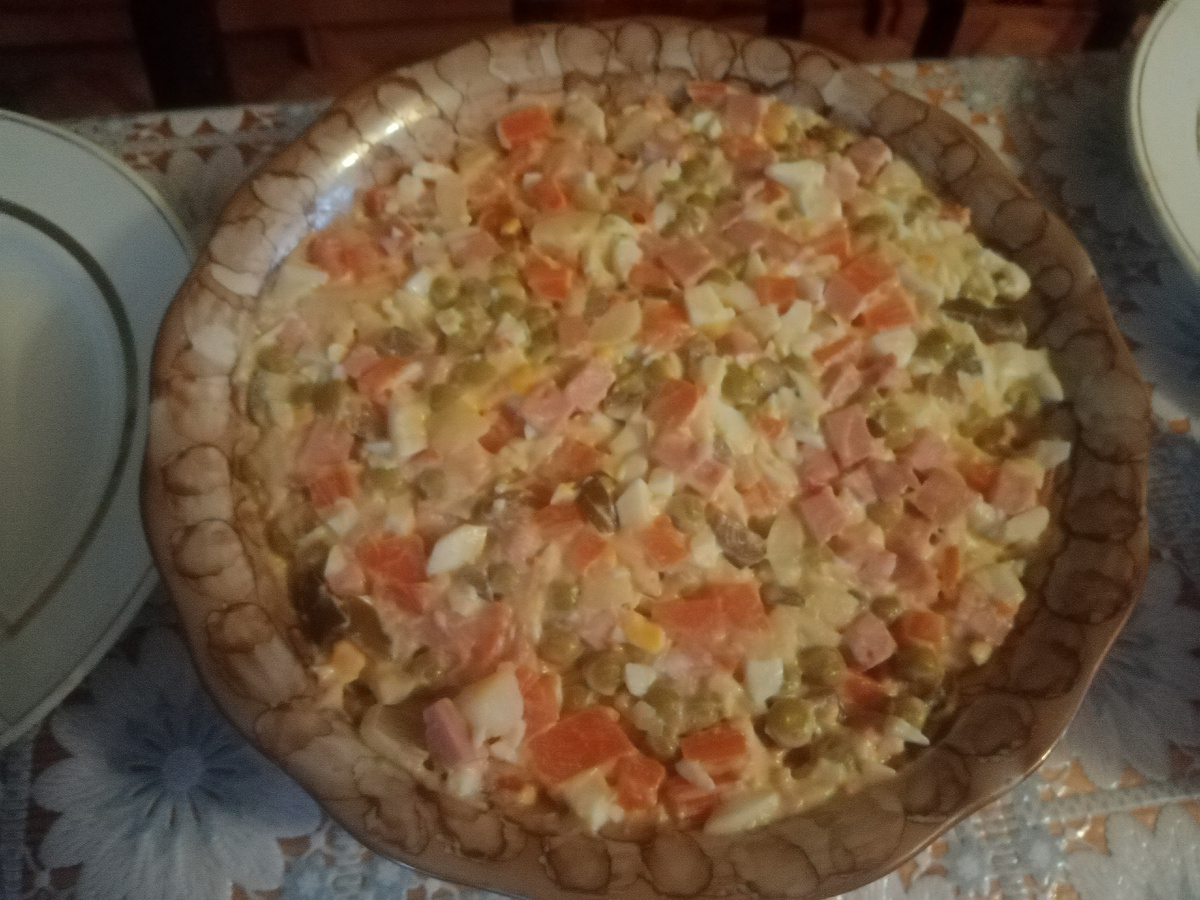 Ингредиенты : - картофель отварной - 4шт - колбаса вареная - 300гр - соленые огурцы - 1 шт - варёные яйца - 4шт - морковь отварной - 2шт - майонез6 ст.л - зелёный горошек - 6ст л - лук репчатый - 1 шт Приготовление: Колбасу, картофель, огурцы, яйца,, морковь, лук, нарезать мелко на квадратики, добавить горошек, майонез и хорошо перемешать.