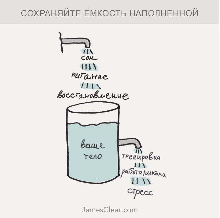 Так же существуют процессы, которые опустошают вашу ёмкость. Это слив — подъем тяжестей или бег, стресс от работы или учебы, проблемы в отношениях или другие формы тревоги и психической нагрузки.