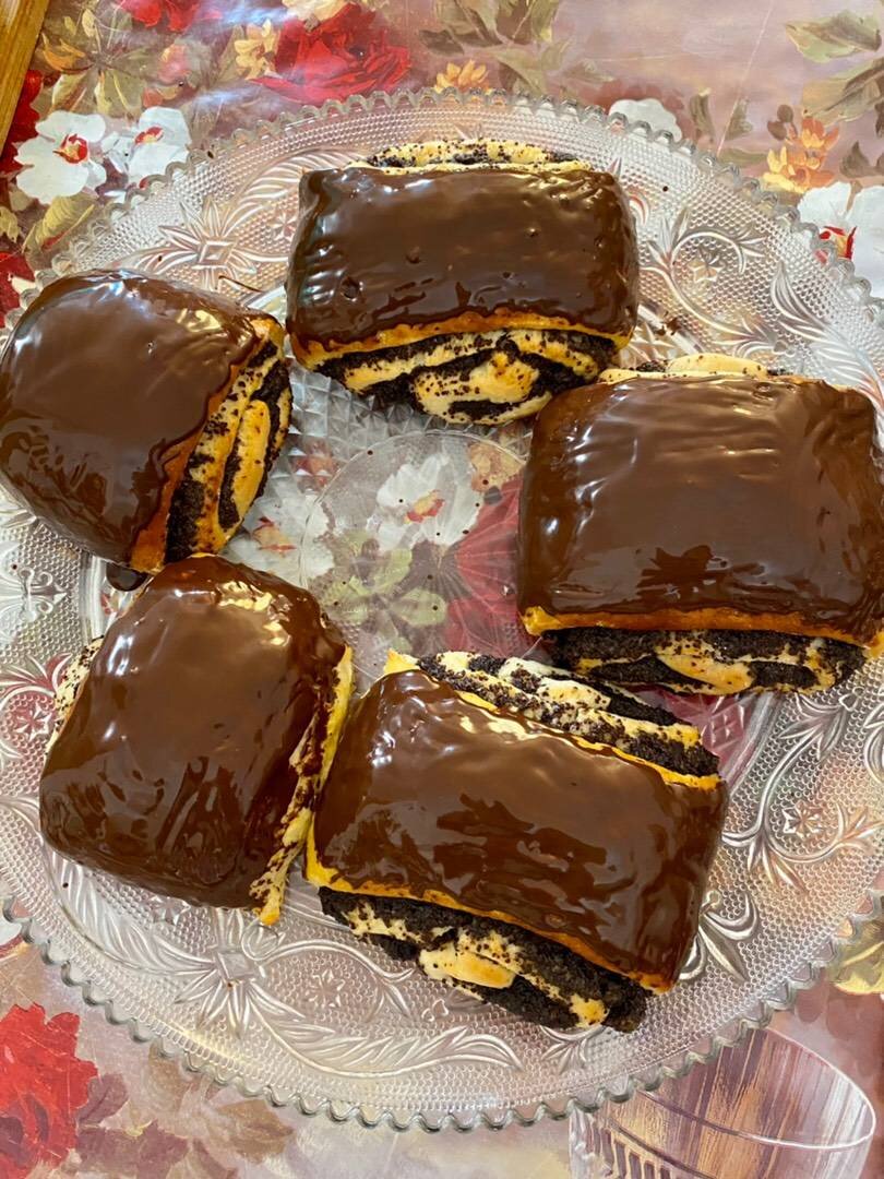 Ингредиенты: Для теста нам понадобится:, яйца, Мука, Сливочное масло , Молоко , Сахар, Соль , Растительное масло, Дрожжи , Начинка:, Готовая маковая начинка, Глазурь:, Шоколад , Растительное масло Способ приготовления: В тёплое молоко добавляем сахар, яйца, дрожжи, соль. Далее всыпаем муку и замешиваем мягкое тесто. Убираем его в тёплое место на 1-1.5 часа. Тесто раскатываем в круглый пласт в толщиной 3 мл, размазываем готовую маковую начинку и скручиваем в рулет. Нарезаем рулет на части, выкладываем на противень и оставляем подниматься минут на 15-20. Смазываем желтком и отправляем в духовку на 20-25 минут при 180 градусов. Готовые остывшие булочки смазываем шоколадной глазурью. Как она готовится я думаю вам понятно. Растапливаем шоколад, можно на водяной бане или же в микроволновке, через каждые 20 секунд помешивая, добавляем к растопленному шоколаду масло, перемешиваем и мажем булки.