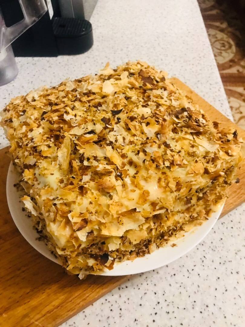 Ингредиенты: Тесто слоеное бездрожжевое, Для крема, молока, ванилина, сахара, яйца, слив масла Способ приготовления: Коржи выпекаем в разогретой духовке до 180 градусов. Для крема смешиваем в кастрюле все ингредиенты кроме слив масла и ставим на огонь постоянно помешивая до загустения. Как только крем начнёт загустевать выключаем огонь и кладём слив масло. Наши коржи разрезаем на две части, верхушку счищаем для крошки чтобы украсить торт. Каждый корж смазываем заварным кремом, украшаем крошкой и отправляем в холодильник для пропитки.