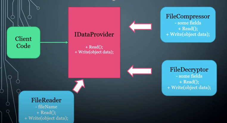 Доброго времени суток. Сегодня у нас на очереди очень интересный паттерн – декоратор. В этой статье мы научимся наделять классы новыми возможностями во время выполнения без лишнего наследования. Декоратор – это структурный паттерн. Такие паттерны отвечают за построение удобных в поддержке и иерархии классов. Декоратор динамически наделяет класс новыми возможностями и является альтернативой множеству подклассов. Некий клиенсткий од обращается к IDataProvider, чтобы записать или вывести данные. IDAtaProvider- это интерфейс или абстрактный класс. Т.е клиент работает по заданному контарту. FileReader – это простая реализация чтения и записи в файл, которая условно лежит под капотом абстракции IDataProvider. Если бы мы пользовались паттерном стратегия, то получилась бы примерно такая структура. На выходе мы получаем несколько классов для работы с файлом и сжатием, с файлом и расшифрованием. Но что, если нам такое не подходит, зачем дублировать один и тот же код. Но мы можем сделать следующ