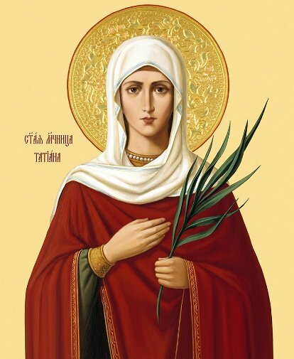 Татиана (Tatiana), в современном русском языке - Татьяна - раннехристианская мученица, почитается православной и католической церквями. В России считается покровительницей Московского государственного университета и вообще студентов. Татиана родилась в Риме в III веке в богатой и знатной семье (ее отец трижды был консулом). Её родители были христианами и воспитывали свою дочь в благочестии. Достигнув совершеннолетия, Татиана решила не выходить замуж. Картина Натальи Климовой. «Мученица Татьяна Римская». При императоре Александре Севере (222-235) Татиана была схвачена и приведена в храм Аполлона, где её пытались заставить поклониться статуе этого бога. Татиана вознесла молитву Иисусу Христу, и произошедшее землетрясение разрушило статую Аполлона и обрушило часть храма, под которой погибло много людей. После этого Татиану подвергли пыткам, но следы мучений исчезали с её тела. По легенде, ее еще вдобавок бросили на арену Колизея, подвергнув ее древнеримскому наказанию «D