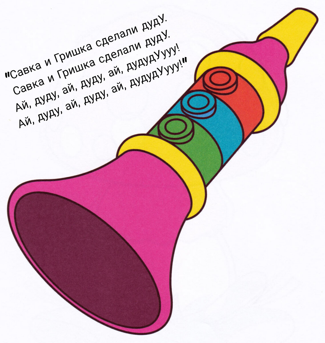 Для начала возьмите игрушечную дудочку. Покажите малышу как на ней играют и изобразите звук дудочки "дудуду". Задайте ребёнку вопрос "Как играет дудочка?".