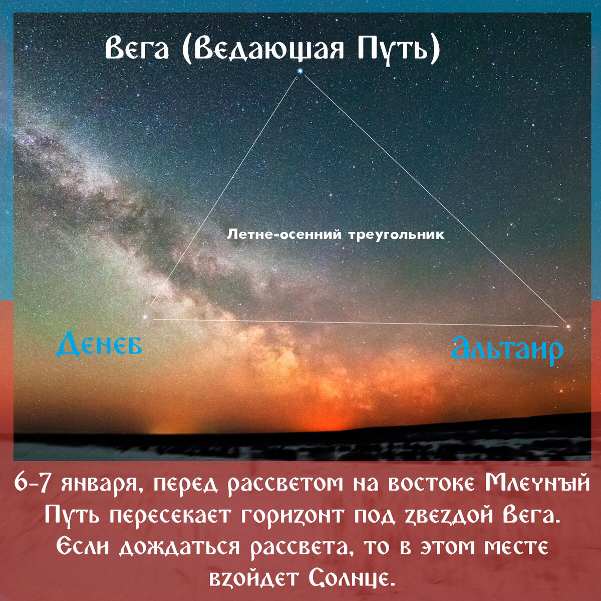 Проще говоря, 6-7 января, перед рассветом глядя на восток, можно увидеть, как Млечный путь пересекает горизонт под звездой Вега. Если никуда не уходить и дождаться рассвета, то именно в этом месте, четко под звездой Вегой, можно встретить восходящее Солнышко.