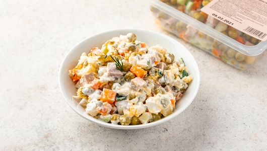 Всем Доброго Аудиофильского! Тут знаете ли Добрый Аудиофил буянит. Дело было как. Напала на меня и всех моих домашних лень. И сделала она это 31го декабря. Надо ведь было стоять у плиты закатав руква и картоху с яйками варить. А тут ЛЕНЬ! В общем с 8ми утра и до 10 с ней велась активная борьба. Проводились профилактические мотивационные беседы! Но к 11 стало ясно, что кроме наряженной Елки ничего больше не случится. А Оливье нужен! Практическое мышление подсказало, что нужно срочно включать вариант Б. В общем делать нечего. Лезу в Яндекс.Го и давай заказывать пока там все не разобрали. Заказал в одном месте. Заказал в другом. Так еще и разных назаказывал. Таким образом у меня из Азбуки Вкуска Оливьешка 2х видов пришла. И из Избенки аж 4 разных вида. И вот сегодня я расскажу кто же из них победил. Тут нужно сказать, что Оливьешки сейчас разные бывают. Есть версии когда там сроки годности на год вперед. Там конечно вкус своеобразный. Но здесь сроки годности из серии хранить в