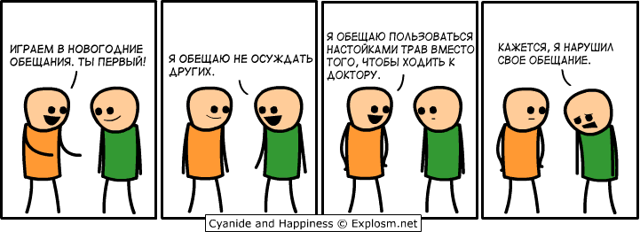 Привет, дорогой друг! В начале января мы все подчиняемся определенным традициям: доедаем новогодние салаты и другие угощения, смотрим рождественские комедии и много лежим на диване. Однако, есть еще одно январское дело, которое выполняют множество людей по всему земному шару — большинство погружается в #планирование и формулирование обещаний. Я решил собрать #комиксы , посвященные этому ритуалу, поскольку именно в первые дни нового года у большинства людей просыпается желание начать жить совсем иначе. И многим творческим людям удается найти в этом #юмор . С ритуалом постановки целей и загадывания желаний в начале года связано много стереотипов. Один из них заключается в том, что у большинства все-таки не получается выполнить все из запланированного, и это становится ясно к концу года. Комиксисты «Cyanide & Happiness» представили, что разочарование будет в разы сильнее, если ты понимаешь, что не выполнишь план уже в первый же день. Если ничего из запланированного не получается воплотить