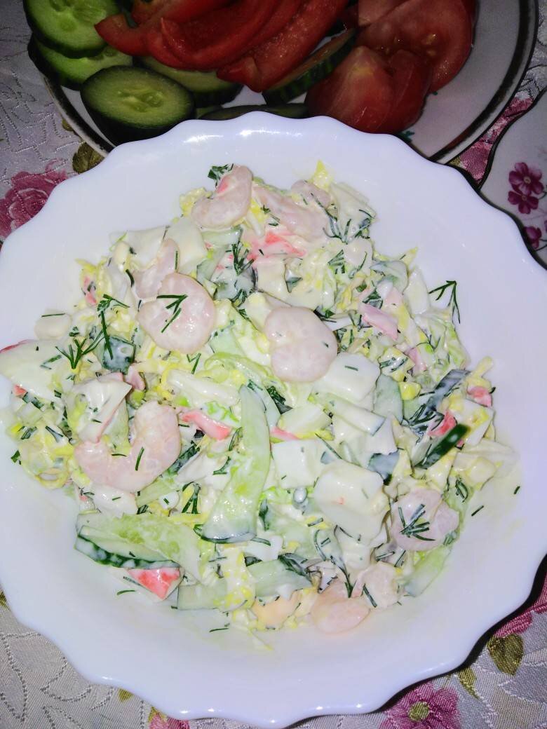 Ингредиенты: варёных яиц, крабового мяса, креветки в рассоле, пекинской капусты, свежий огурец, укропа, майонез или сметана + фр. горчица для заправки
