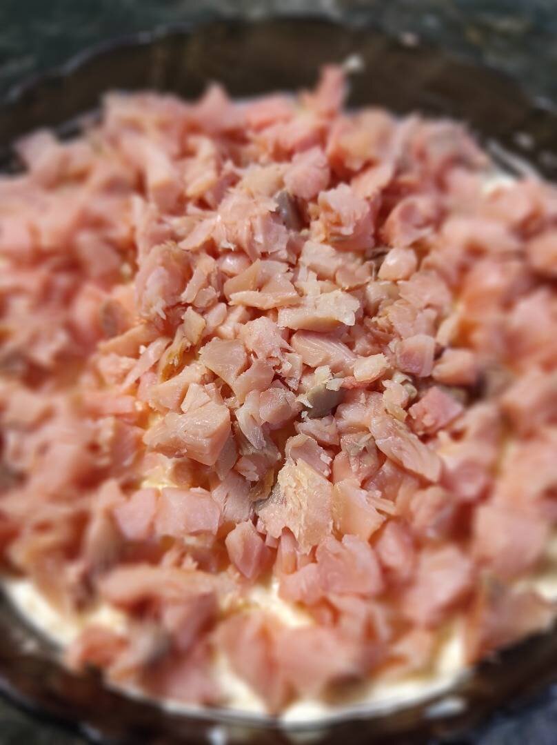Дальше яйцо и сыр трём на мелкой терке и не забываем про майонез. Сверху должна быть красная рыба, порезанная мелкими кубиками. Готово. Приятного аппетита!
