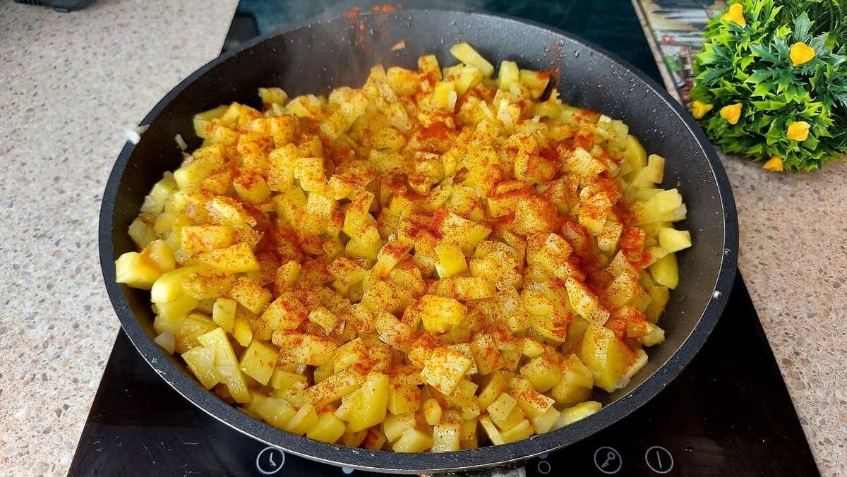 Это моё самое любимое блюдо из картофеля. Получается сытно и очень вкусно. Гостям всегда нравится. Я в нём уверена на все 100%. Беспроигрышный вариант обеда или ужина. Рецепт очень прост в исполнении. Сочетание довольно популярное. Все ингредиенты простые. Итак, очищенный картофель нарезаем мелкими кубиками и обжариваем на растительном масле. Когда картошка станет мягче, добавляем измельченный лук. Обжариваем. Солим, перчим по вкусу. Доводим картофель до готовности. Затем его необходимо слегка размягчить, но в картофельное пюре превращать не надо. В отдельной миске взбиваем яйца и заливаем смесью картошку. Хорошо перемешиваем. Перекладывая равномерно половину картофеля на дно формы для выпечки. Форму смазываем сливочным маслом. Сверху кладём тонко нарезанный твердый сыр. Затем идёт ветчина или колбаса, начинку выбирайте на свой вкус. У меня карбонад (копчено-вареный). Ещё раз сыр. Сверху распределяем вторую часть картофеля. Отправляем блюдо в разогретую духовку до 200 градусов н