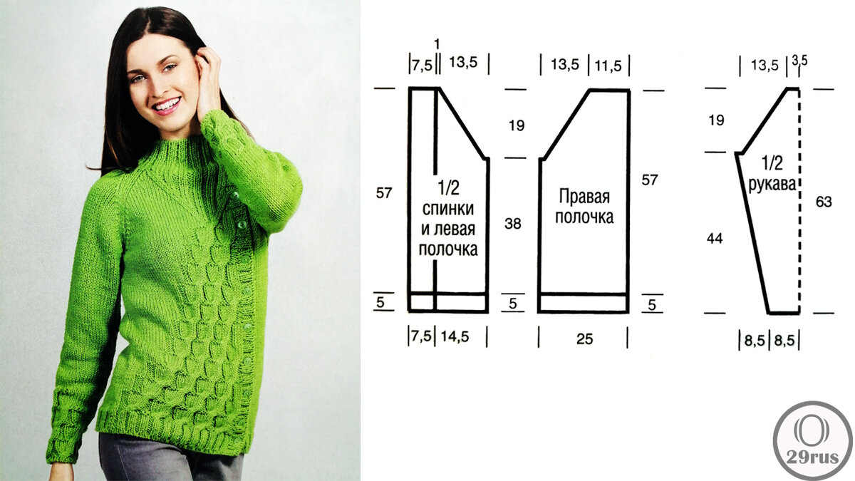 Пройму и регланный скос с правого края выполнить, как описано для спинки.