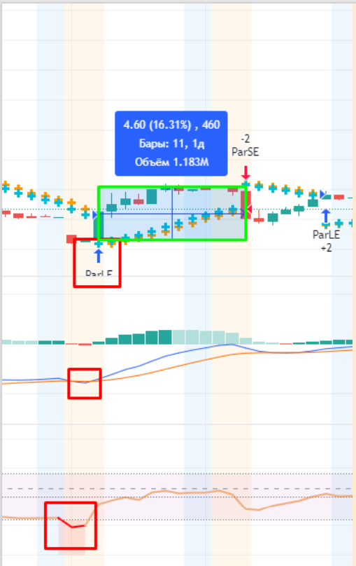 Долгосрочный трейдинг на деле может показать неплохие результаты, если вы будете грамотно проводить аналитику Он идентифицируется открытыми позициями на 1-5 дней и прибылью от 3% до 5%, когда краткосрочный и среднесрочный по 1-3% Правила торговли : 1) Торгуем на ТФ 2 часа - 1 день или диапазон 6 месяцев - 1 год 2) Связки : 1) RSI + MACD + PSAR 2) KTS + Аллигатор + RSI 6/14/24 3) Увеличенные стопы Первая стратегия показывает более интересные результаты, чем вторая, но под каждую компанию, как я и говорил ранее, надо подбирать одну из двух, так как вторая может работать лучше на одной, а первая на второй компании В данном случае все также просто : 1) Видим, что RSI пришел в зону смены тренда 2) За ним MACD сразу же на это реагирует 3) Долго не ожидая, видим сигнал от PSAR и получаем результат в 16% прибыли, если бы взяли на вершине свечи, то 7.5% прибыли Нет ничего сложного. Чем больше диапазон - тем реже сигналы на вход, но выше профит Связки отрабатывают себя на отлично, если вы пользу