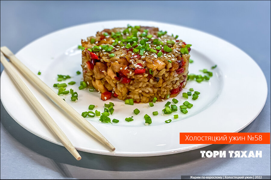 Десяток раз взмахнуть ножом, попереставлять кастрюлю со сковородкой, и вкуснейшее японское блюдо готово: тори тяхан