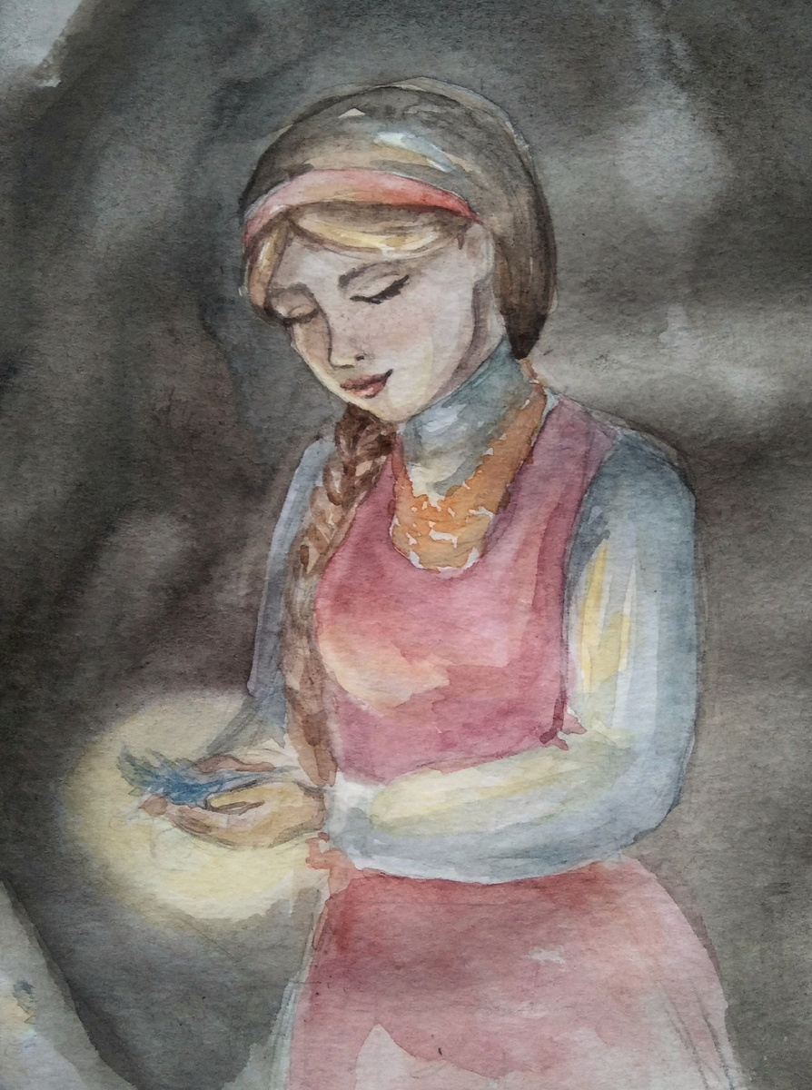 С самого утра я активно принялась за работу, то есть села перечитывать сказку "Финист-ясный сокол". Так как с воображением пока беда жуткая, образы пришлось буквально насильно придумывать. И один-таки родился. Мне достаточно ясно представилась Марьюшка с заветным пёрышком Финиста в руках. Проблемы, кстати, возникли только с озой. Ведь придумать её легко, а вот воплотить... В общем и брат мне позировал, и сама у зеркала сколько крутилась, и добилась-таки! Потом для интереса и пользы скинула работу преподавательнице. Она оценила и дала добро на доработку. Теперь придется детализировать, а я ведь планировала зарисовку😅 В общем, да не пропадёт мой энтузиазм к завтрашнему дню!