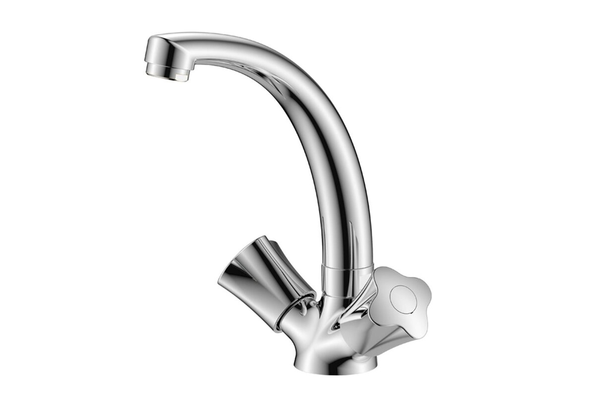 Традиционный смеситель с двумя вентилями подойдет тем, кто привык именно к такому типу. При этом модель выглядит современно и минималистично. Изящный излив чуть расширен у основания. Вентили не имеют цветовой маркировки горячей и холодной воды, которая часто не вписывается в дизайн мойки. Модель подойдет для небольшой раковины.