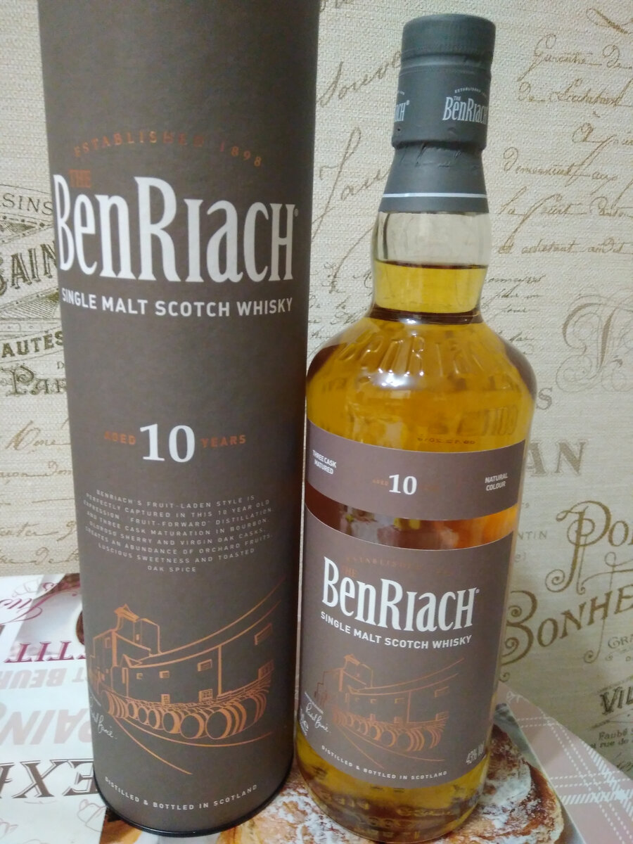 Тип: single malt scotch whisky. Винокурня: BenRiach. Год розлива: 2019 Возраст: 10 лет. Крепость: 43%. Регион: Speyside Тип бочки: Бочки - американского дуба из под бурбона (10 лет), бочки из под хереса олороссо (10 лет), бочки из под нового обожженного американского дуба(10 лет). Колер: нет. Холодная фильтрация: да. Цвет: светлый янтарь. Плотность: тело легкое, жидковатое; ножки стекают быстро, тонкие, не маслянистые. Аромат: Сладко-фруктовый, карамельно-сливочный аромат. Приятный аромат. Ванильно-цитрусовые легкие оттенки. Характерная бурбоновая выдержка. Чуть деревяшки - свежие мокрые опилки, фрукты. Винный запах чуть-чуть. Вкус: Яркий, многогранный вкус. Легкий, сладкий, ванильный, цитрусовый. Очень приятный на вкус, крепость не чувствуется. На заднем плане - орехи, чуть дерево, фрукты. Чуть маслянистый, сладко-кислый вкус. Чуть медово-орехового вкуса. Никакого дыма. Финиш: финиш есть, финиш мягкий. Чуть деревяшки, горчинка, цитрусовость с фруктами. Хереса почти не чувст