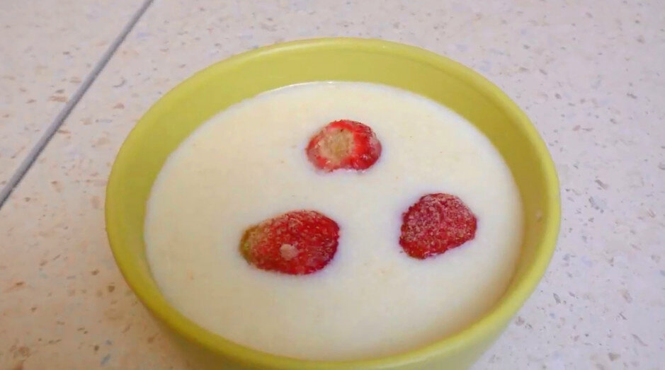 - Выливаем в тарелку, можно добавить ягод. Я добавляю клубнику, которую сам заморозил летом.